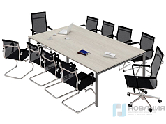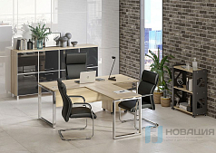 Прямоугольная столешница офисной мебели поддерживается О-образным каркасом из металла. Пластиковые элементы на опорах из труб дополняются винтами для регулировки под неровности пола. Панель из ЛДСП отделана кромкой.