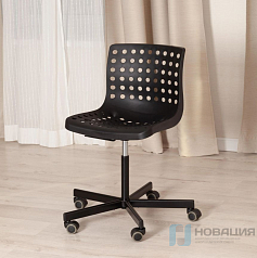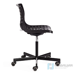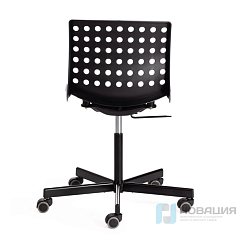Мебель дополняется подлокотниками из пластика, спинка обтянута сеткой, сиденье оформляется тканью-сеткой. Высота кресла изменяется, пятилучье (d=640 мм) оборудуется роликами с покрытием из полиуретана.