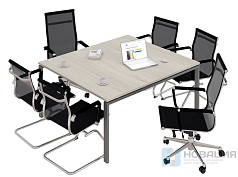 Стол представлен металлическим каркасом и столешницей из ЛДСП. Ножки изготовлены из труб размером 40х40 мм, траверсы - из трубы 40х20 мм. Столешница крепится к каркасу футерками и винтами. Оснащен пластиковыми регулируемыми опорами с винтом М8. На столешницу нанесена кромка толщиной 2 мм.