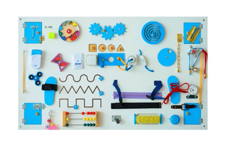 Покрытие выполнено с использованием безвредных красок на водной основе. Бизиборд наполнен множеством мелких интерактивных элементов: дверцы с замками, спиннер, счёты, звонок и др.