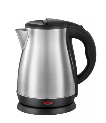 Электрический чайник с металлическим корпусом оснащен индикатором включения и функцией автоматического отключения для безопасного использования.