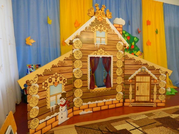 Распашная панель с тремя створками декорируется рисунком с обеих сторон. Изображение дома в летнее или зимнее время впишется в сюжет представления.