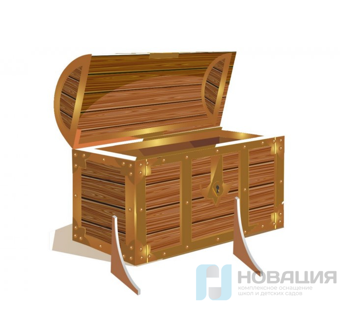 Элемент оформления для сцены и холла в ДОУ представлен резной панелью. Имитация сундука с открытой крышкой изготавливается из МДФ, закрепляется на подставках. Изображение наносится с обеих сторон.