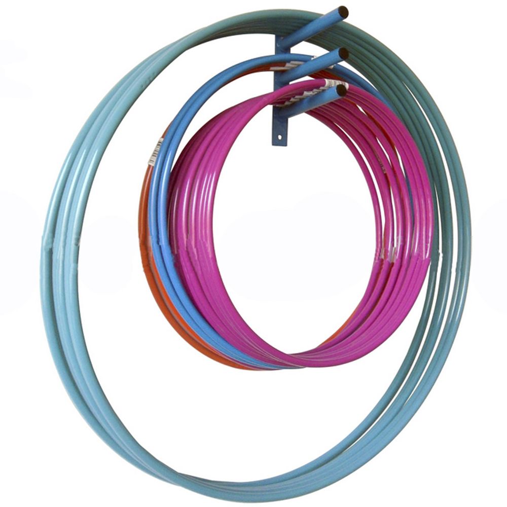 Конструкция представлена тремя кронштейнами на едином основании, которое монтируется к стене в спортзале. Концы металлических труб оснащаются заглушками. Держатель позволяет хранить до 30 гимнастических обручей.