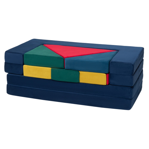 Бескаркасная конструкция состоит из 4 прямоугольников и 8 фигурок разных размеров и форм. Может собираться в диван, матрас или домик игр. Не имеет острых углов.