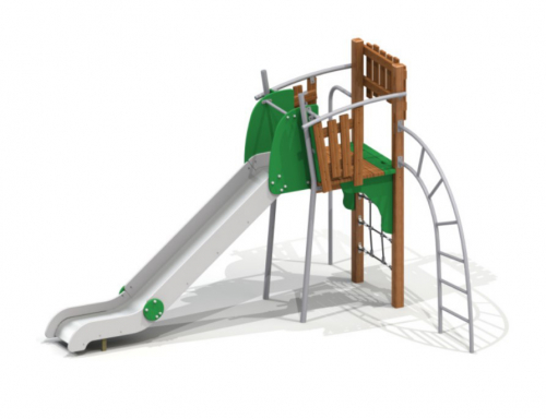 Горка с нержавеющим скатом опирается на металлические и деревянные столбы. Башня без крыши дополнена ограждениями. Есть защитная секция с перекладиной. Канатная сетка и наклонная лиана позволяют укрепить мышцы рук во время лазанья.