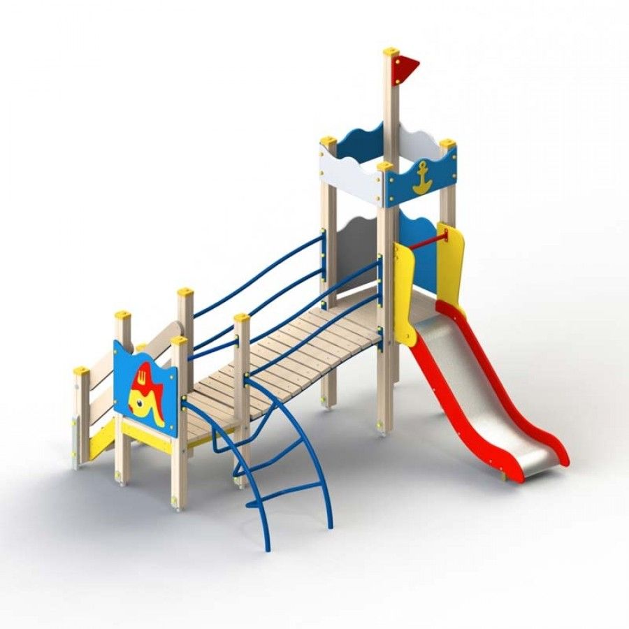 Верхние края ограждений и крыши волнообразные. Внешние стороны комплекса украшены изображением золотой рыбки, накладным якорем. Нержавеющий скат окружен бортами (h 100 мм), дополнен защитной секцией с перекладиной.