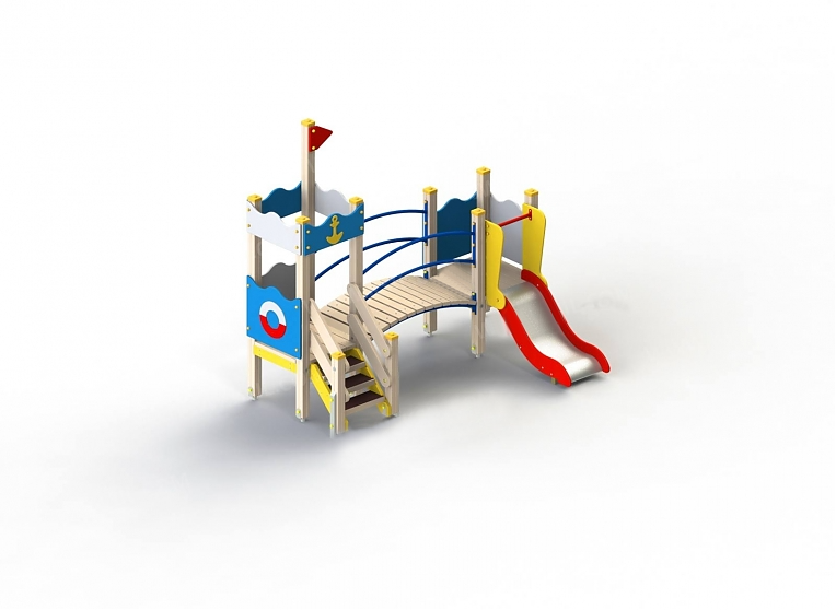 Комплекс украшен декоративным флагом, изображением спасательного круга и золотой рыбки. Верхние стороны ограждений и крыши волнообразные. Металлический скат окружен бортиками, дополнен защитной секцией с перекладиной.