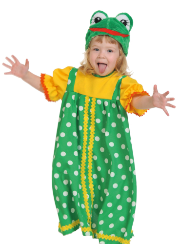 Костюм для девочки состоит из платья с имитацией сарафана в горошек и шапочки в виде головы лягушки. Может использоваться для проведения спектаклей, сценок и костюмированных представлений.