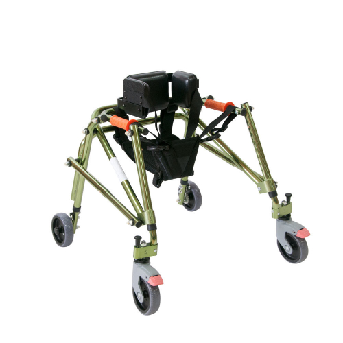 Складная конструкция состоит из прочной рамы, нескользящими ручками, 4-х колес. На раме ходунков закреплен поддерживающий фиксатор для таза. Элемент выполнен из мягкого материала, пропускающего воздух. Ходунки регулируются по высоте 8 положений регулировки с шагом в 2,5 см.
