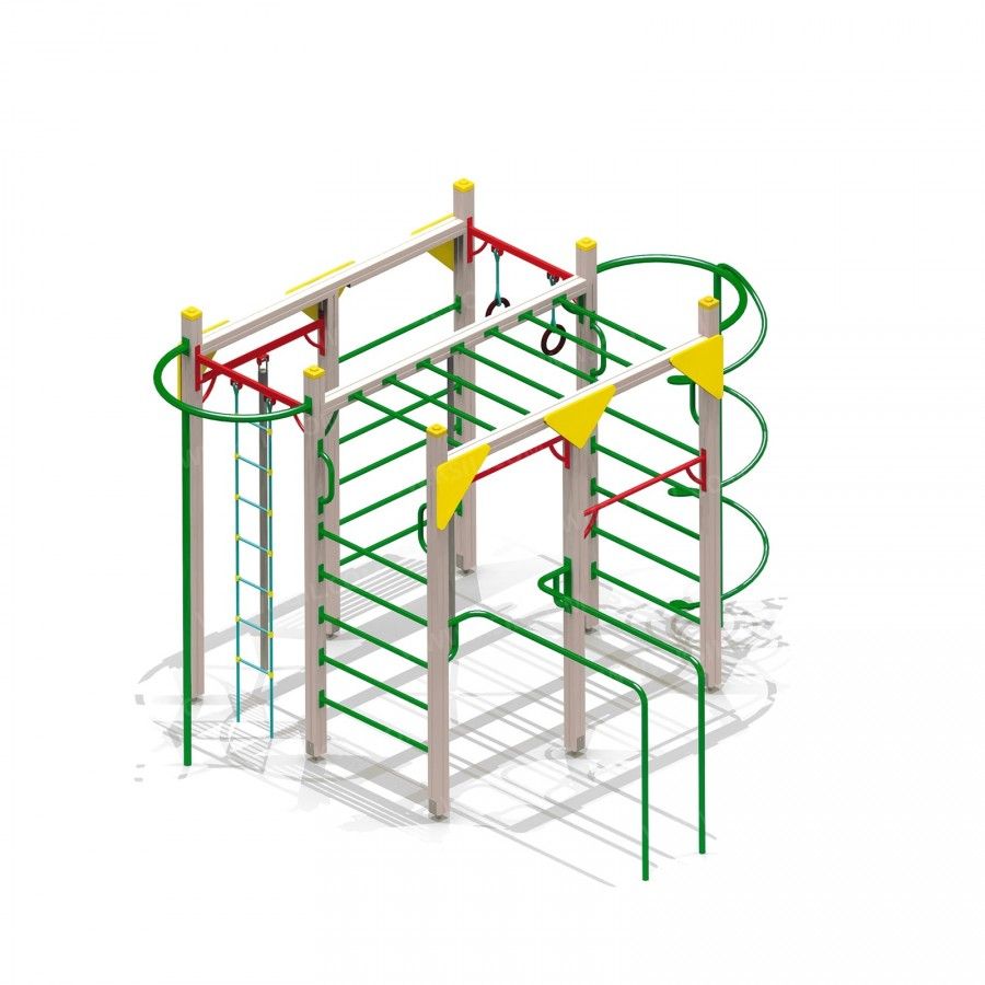 В составе комплекса: несущие столбы, поручни, перекладины, вертикальный шест, рукоход, гибкая лестница, параллельные брусья, гимнастические кольца, вертикальный шест со спиралью, шведская стенка, канат.