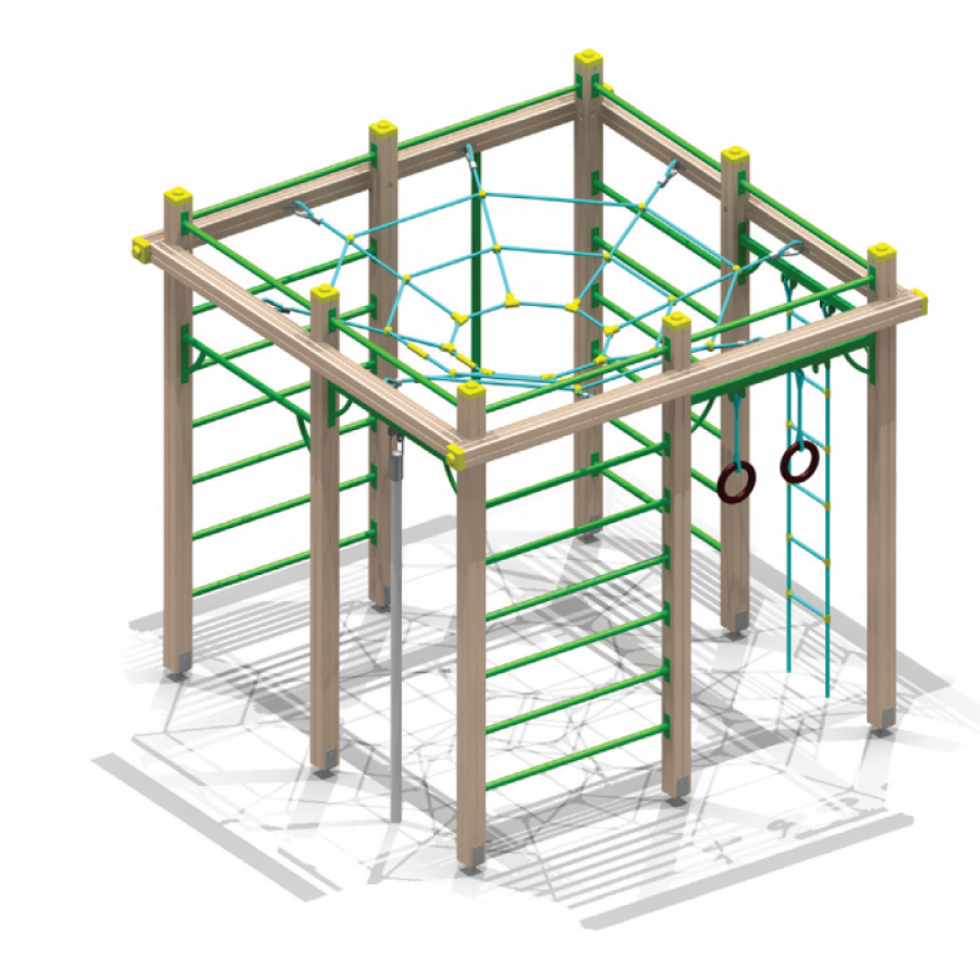 В составе комплекса: несущие столбы, перекладины, гимнастические кольца, канатная сетка, гибкая лестница, вертикальный шест, канат, шведские стенки.