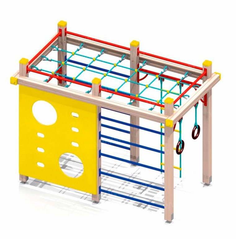 Перекладина с гимнастическими кольцами изготовлена из металлической профильной трубы сечением 50х25 мм, гибкой подвески и колец из влагостойкой фанеры или пластика (в зависимости от заводской партии). Балки, перекладины и раскосы – из металлической трубы D 33 мм, альпинистская стенка – из влагостойкой фанеры 21 мм.