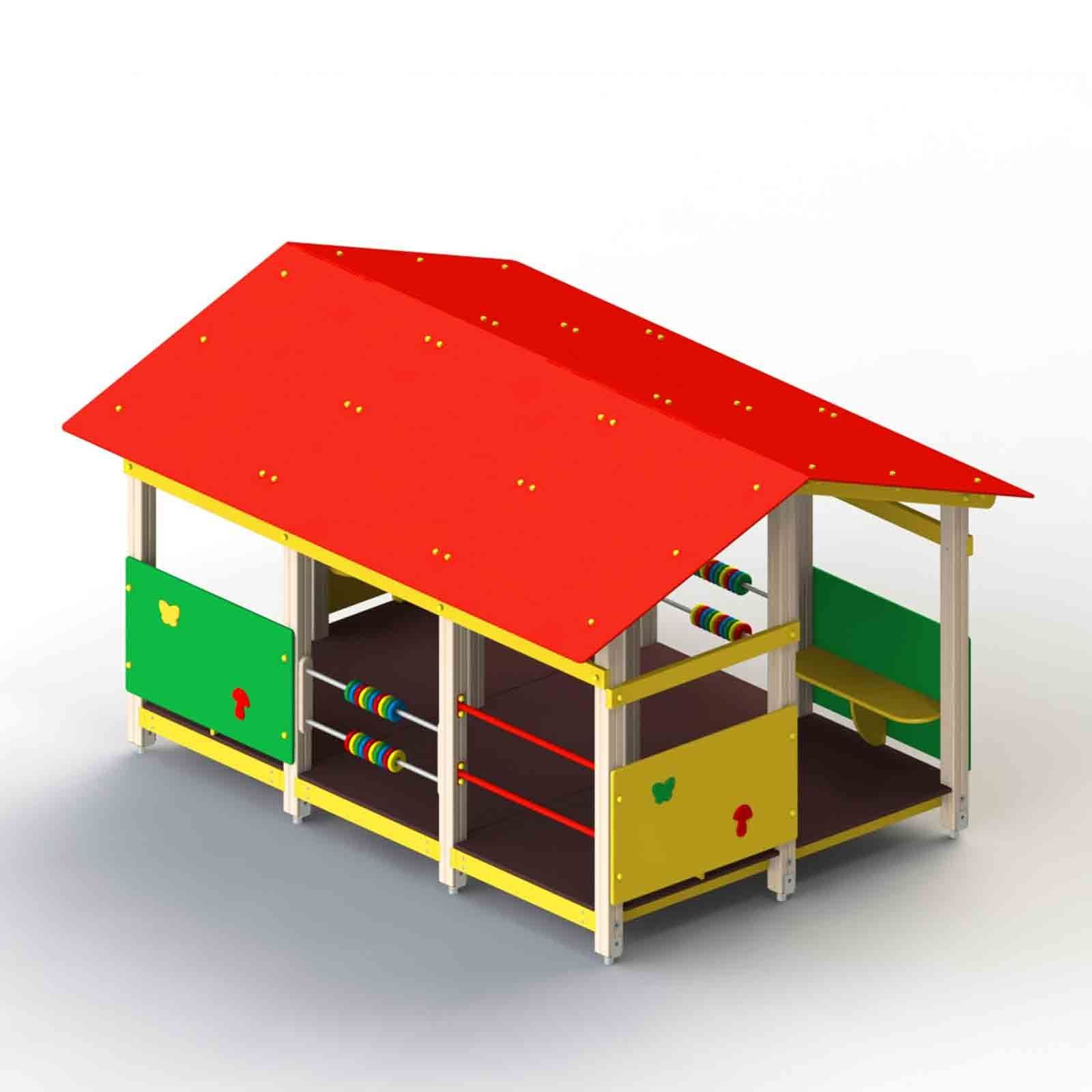 Конструкция включает в себя: домик с 2-скатной крышей, боковые панели со скамейками, счеты (2 шт.), перекладины.