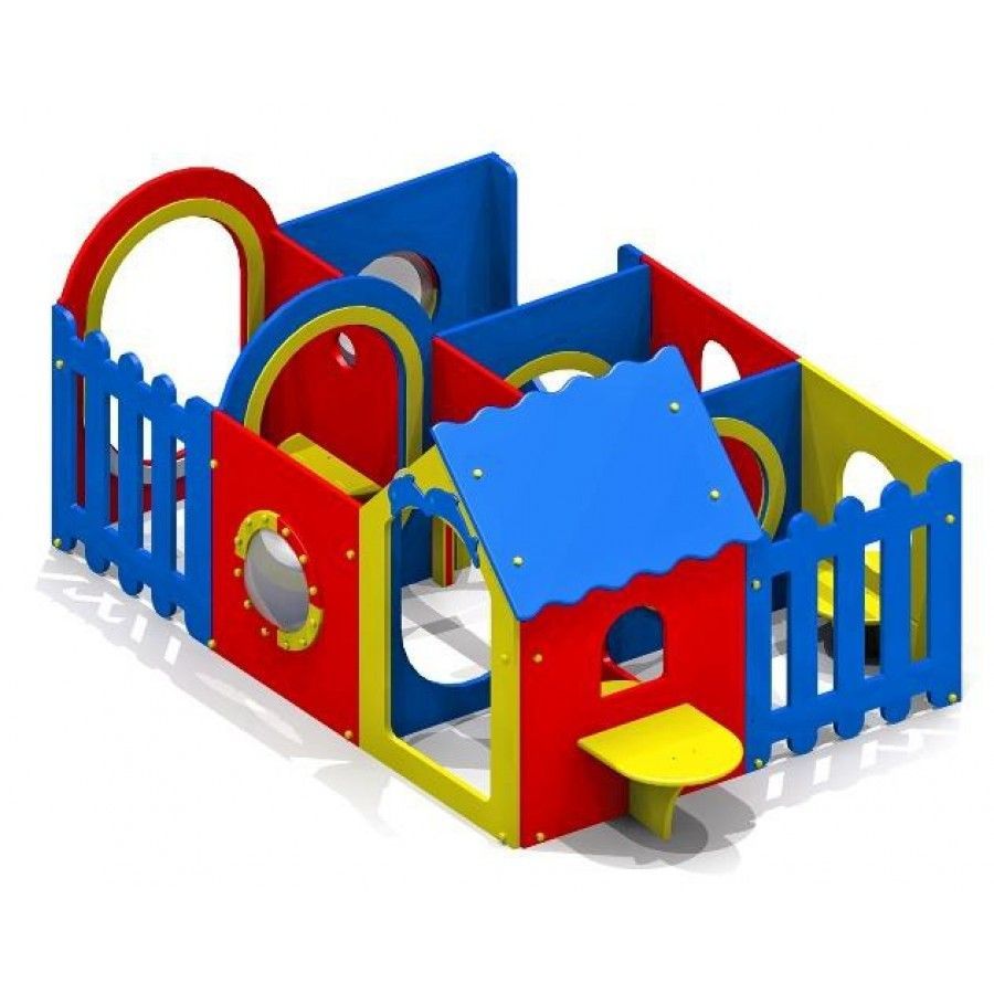 Игровой комплекс включает в себя 6 секций. Устойчивый домик с полуоткрытой крышей соединяется арками и лазами с другими элементами конструкции. В секциях есть окошки, столики и сиденья, комплекс окружается заборчиком.