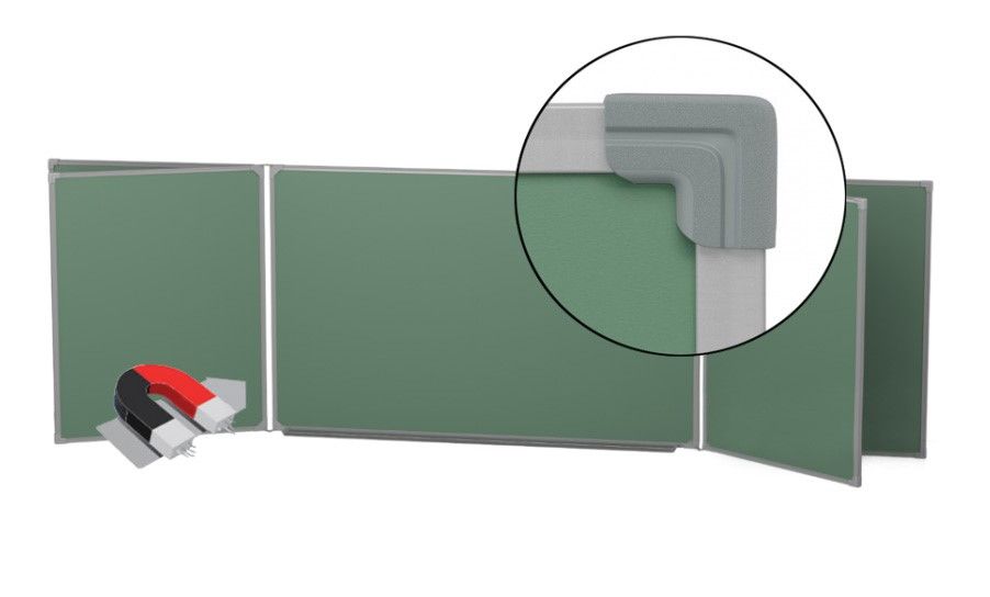 Классная доска для школы оснащается 2-мя подвижными секциями на петлях и 7-ю магнитно-меловыми поверхностями. Листы из стали закрепляются в металлическом профиле с закругленными углами.