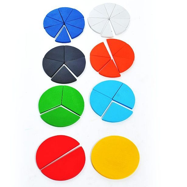 Набор состоит из круглых пластин 8-ми цветов. Каждая делится на части: 2, 3, 4, 8 или 10 шт. Пособие подготавливает ребенка к изучению математики, дает представление о дробях.