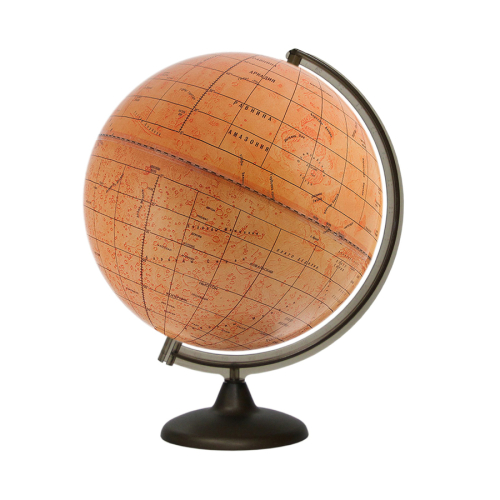 На глобус нанесена физическая карта Марса. Долины, равнины горы и другие объекты сопровождаются подписями на русском языке.