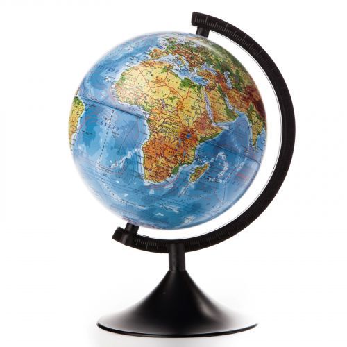 Уменьшенная модель земного шара поставляется в коробке. Сферу можно вращать вокруг оси. Основание подставки круглое. Цветная поверхность шара дополнена условными обозначениями. Выделены границы государств, есть названия стран и крупных географических объектов на русском языке.