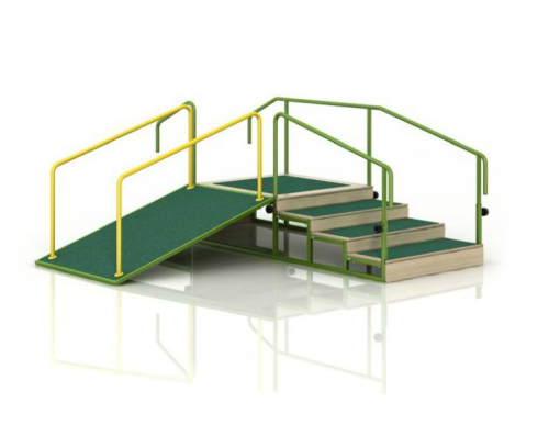 Горка со ступенями разной высоты и плоской наклонной поверхностью используется в ДОУ. Пандус и лестница окружаются поручнями, которые изменяются по высоте. Яркие цвета перил рассчитаны на слабовидящих. Влагостойкие ступени покрываются гипоаллергенным лаком. Ковровое покрытие не скользит. Оборудование предназначено для отработки навыков ходьбы, восстановления двигательной активности после травм или при ДЦП.