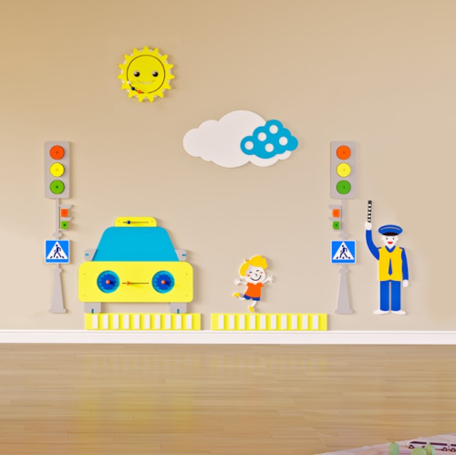- Мини, размеры (ШхВ) - 2000х2000 мм, вес - 15 кг, в комплекте - элемент “Солнце”, элемент “Облако”, элемент “Светофор” (2 шт.), элемент “Ребенок”, элемент “Машина желтая”, элемент “Полицейский”, элемент “Зебра”;
