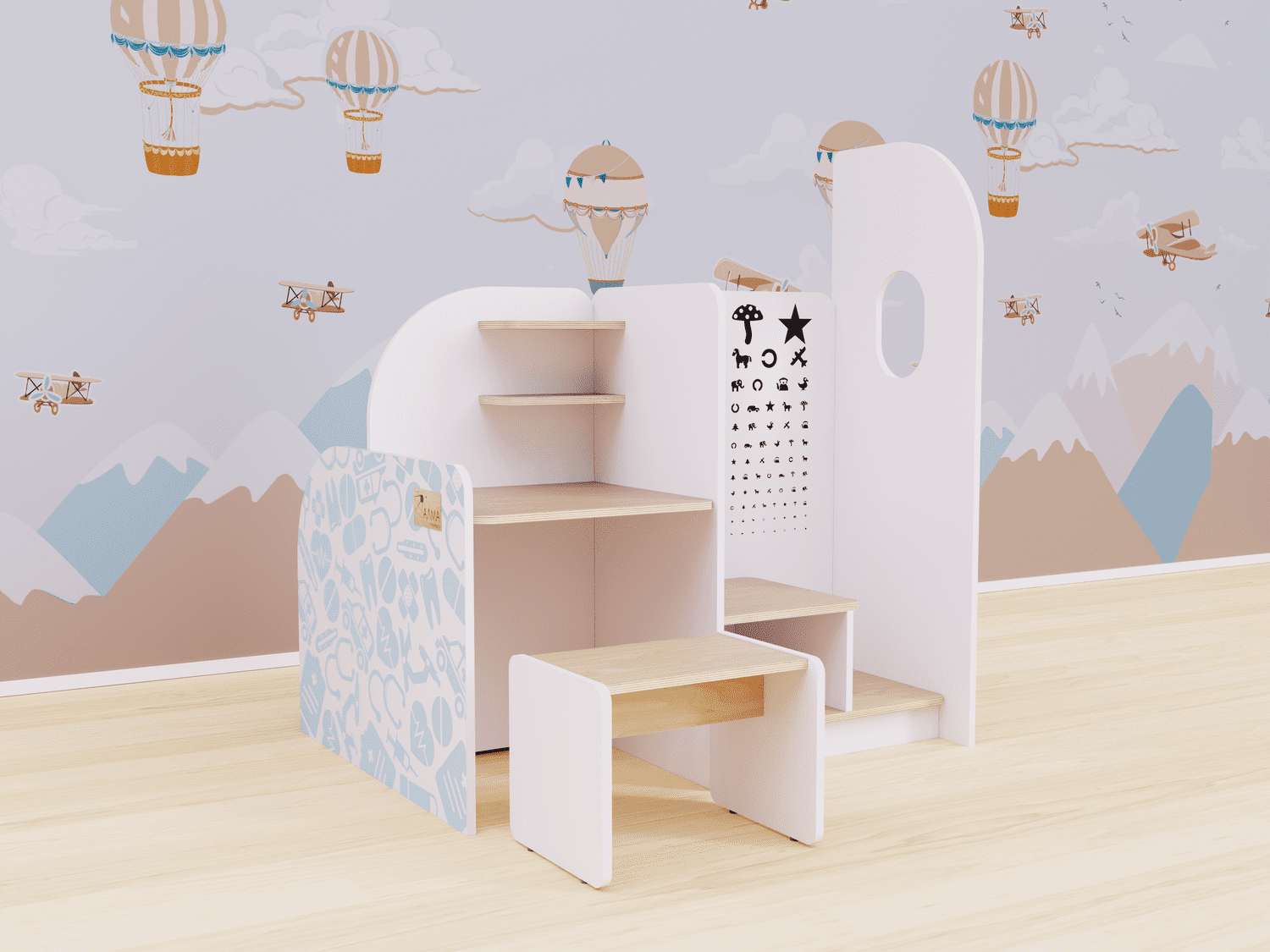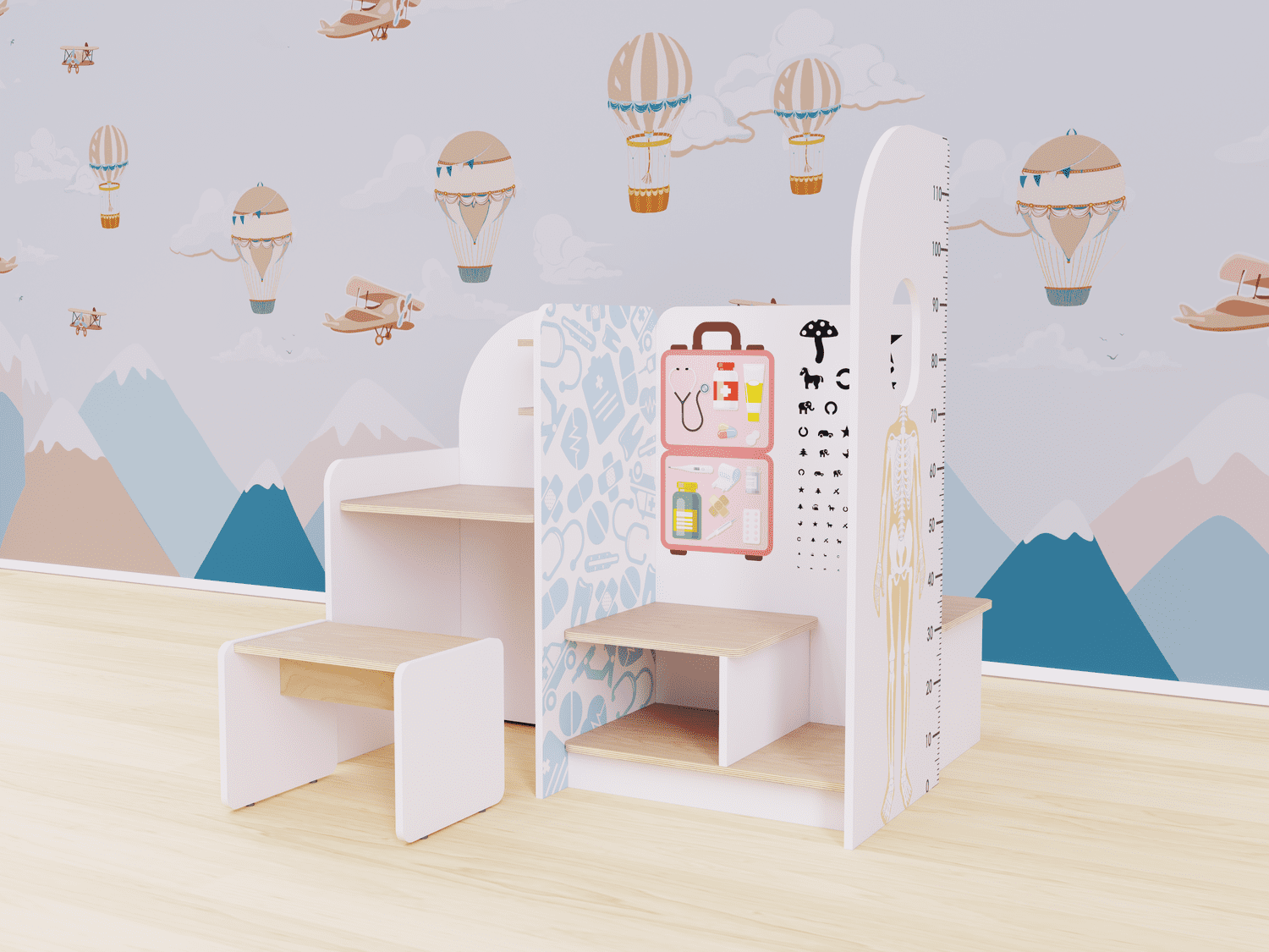 Игровая зона спроектирована для использования с разных сторон. Фасад подходит для приёмного покоя или кабинета врача с кушеткой, а также имеет системы хранения для игрушек. Обратная сторона включает кабинет для врачебного приёма с встроенным столом и стулом, а также отдельным табуретом и полками.