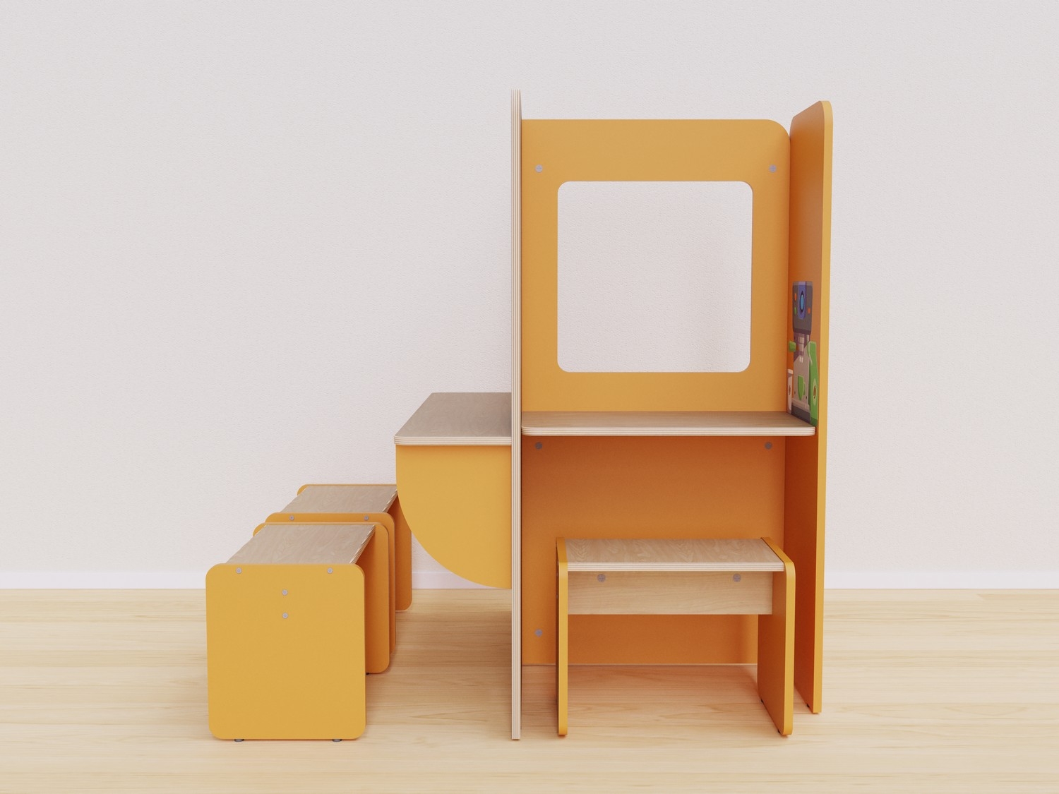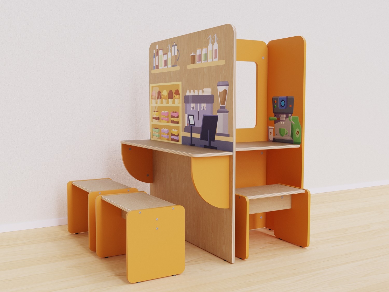 Игровая зона «Кофейня» предназначена для сюжетно-ролевых игр в детских садах и дошкольных учреждениях, позволяя детям примерить роли бариста, кассира и посетителя.