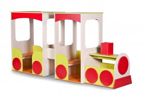 "Паровозик"  — это оригинальный игровой модуль для коллективной игры в ДОУ. Конструкция представлена 2-мя крытыми блоками-вагонами, которые соединены деревянными элементами, и локомотивом. В общей сложности в "Паровозике" 6 мест для сиденья с нишами, под сиденьями можно хранить игрушки. Локомотив состоит из полки, декоративной передней панели и ящика-бокса открытого типа.