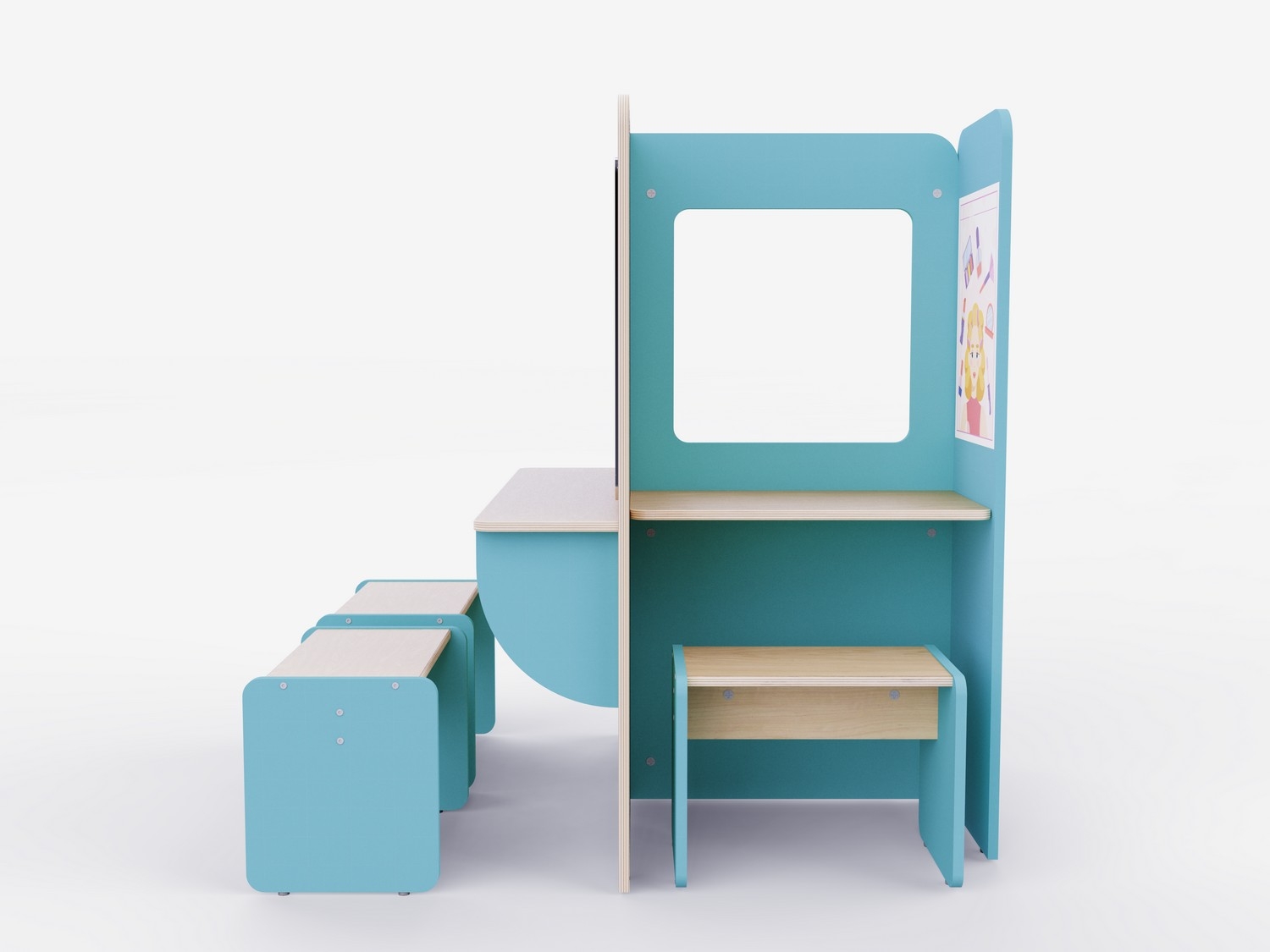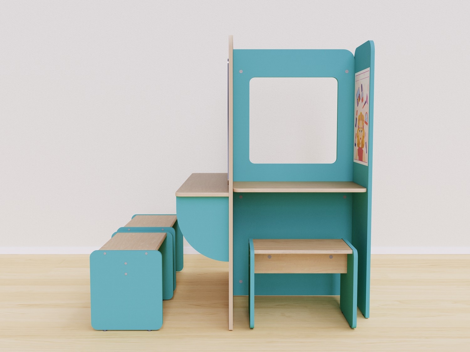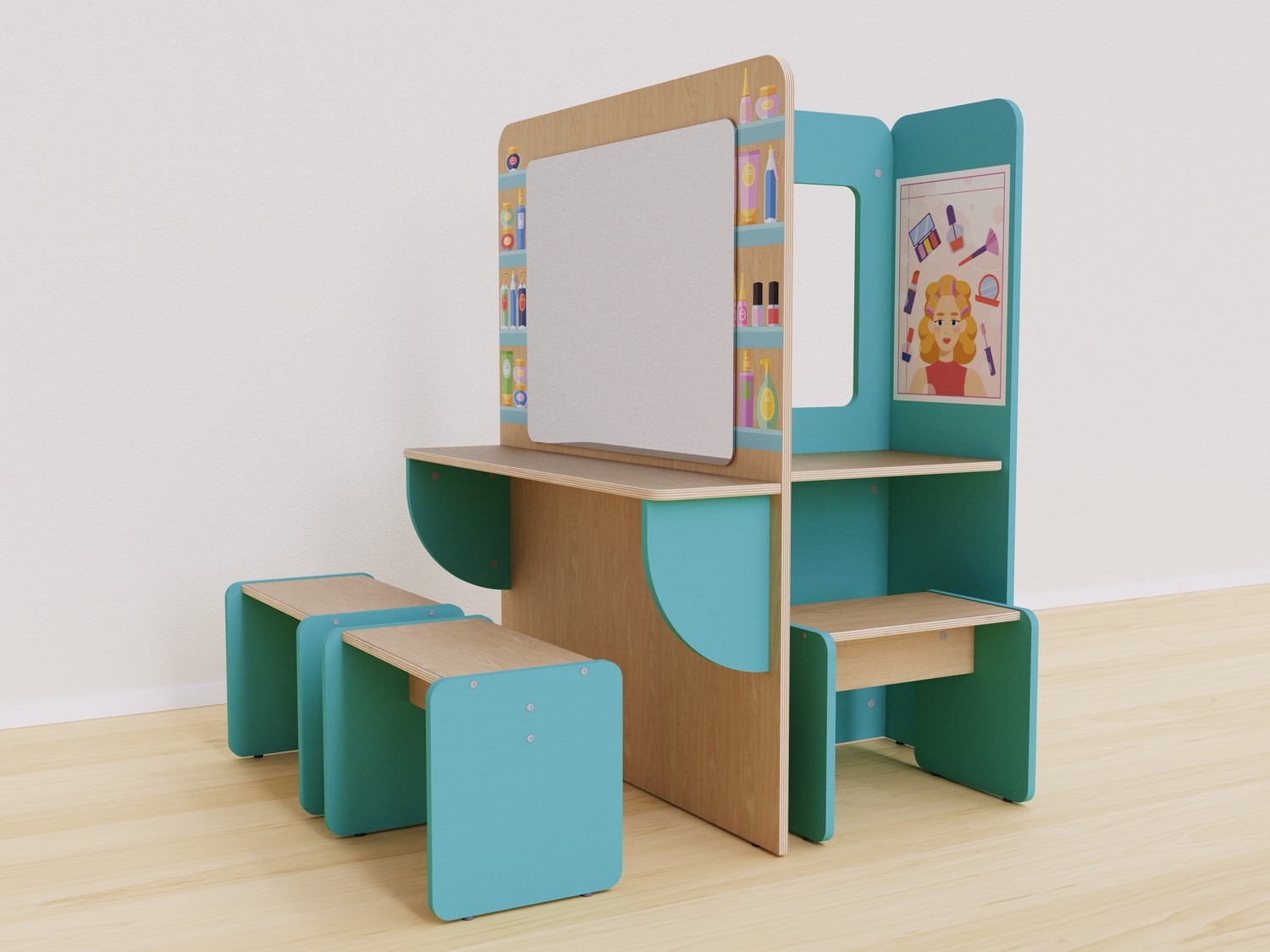 Конструкция разработана так, чтобы дети могли использовать все ее стороны. Каждая сторона отражает разные аспекты работы в салоне красоты: