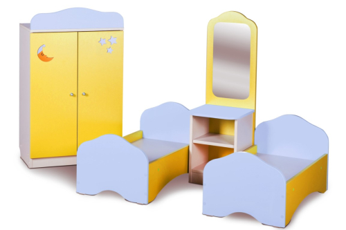 Миниатюрная мебель, выполненная в приятных тонах, декорированная аппликациями, повторяет интерьер спальной зоны в настоящей комнате. С ее помощью дети смогут попробовать себя в роли взрослого родителя, ухаживая и заботясь о своем игрушечном малыше. Сюжетно-ролевые игры научат детей ответственности, собранности и порядку.