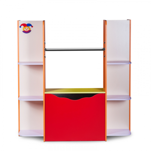 Оснащен стеллажами с полками и нишей с распашными дверцами, в которой удобно хранить куклы и аксессуары. Планка для закрепления занавесок регулируется по высоте.