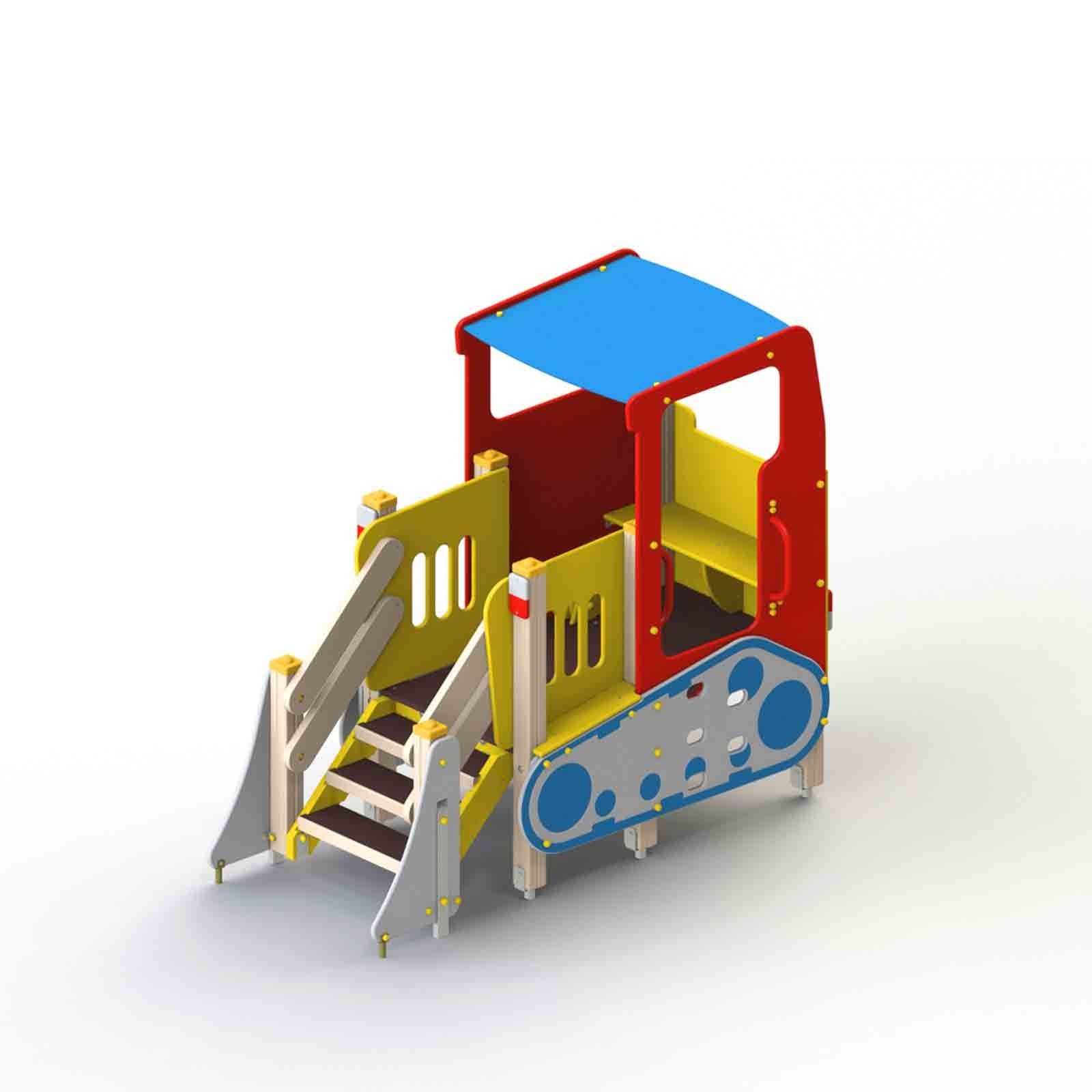 Лестница из ламинированной фанеры не скользит, поручни из деревянных досок помогают подняться на площадку. Ограждения полубашни оснащаются перфорацией. Под влагостойкой крышей закрепляется сиденье с закругленными краями. Кабина в виде бульдозера оформляется фанерными гусеницами. В панелях предусматриваются прорези для ног.
