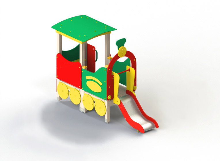 Пол изготавливается из деревянных досок. Несущие столбы из клееного бруса бетонируются в землю. Поручни помогают подняться в уличный комплекс. Кабина оснащается декоративной аркой с прожектором. Имитация будки машиниста дополняется декоративными деталями в виде колес и трубы. Стальной скат окружается фанерными бортиками. Стартовый участок оборудуется защитной секцией и перекладиной.