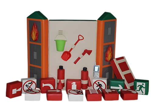 Тематика набора посвящена пожарной безопасности. На мягких панелях изображено здание в огне. Прилагаются игрушечные знаки, инструменты первой необходимости, телефон. Реквизит поможет рассказать о профилактических и экстренных мерах при возгорании.