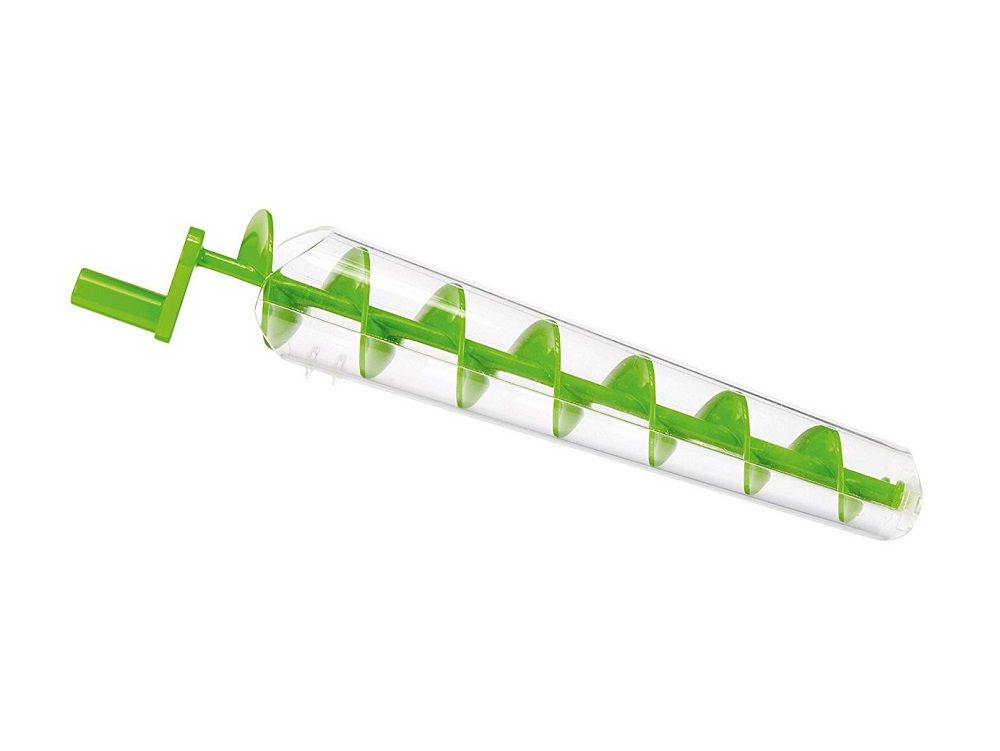 Изделие располагается под углом к горизонтальной поверхности и погружается в емкость с водой, грунтом или песком. Через нижний конец трубка наполняется материалом. Ребенок двигает мягкую рукоятку, наполнитель перемещается вверх по спирали и выходит из вершины трубки.
