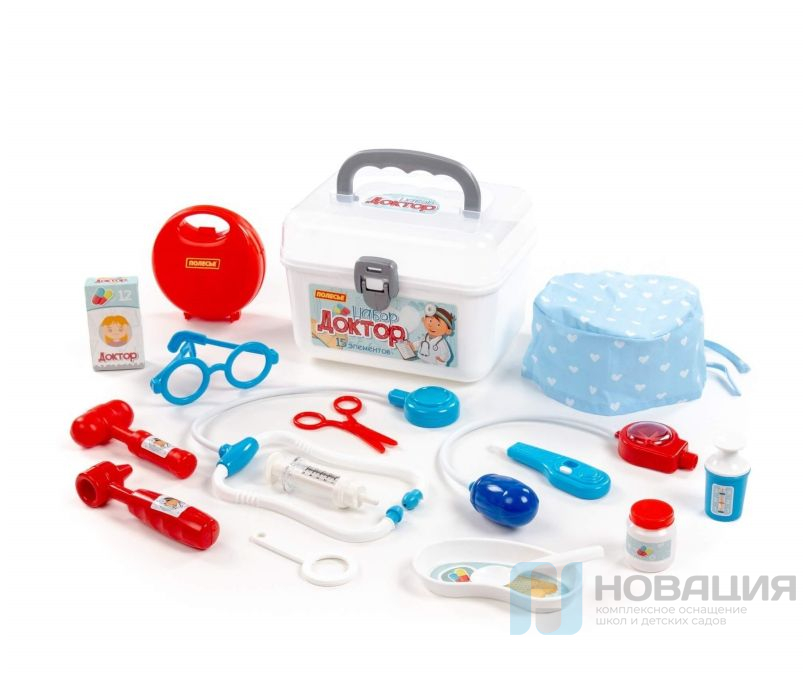 Набор для сюжетно-ролевой игры знакомит дошкольников с атрибутами врачебной профессии. Занятия с безопасными предметами позволяют избавиться от страха перед посещением поликлиники, узнать новое о деятельности доктора, запомнить названия и назначения приборов.