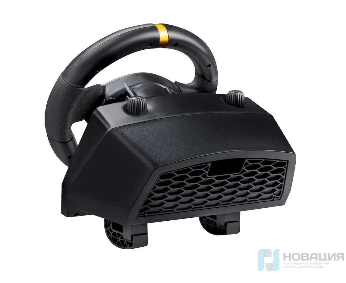 Устройство дополнено двумя встроенными вибромоторами для точной тактильной отдачи, подрулевыми переключателями и 4‑позиционным D‑Pad. Регулируемая чувствительность и возможность настройки угла поворота от 180° до 1080° позволяют подобрать параметр под любой стиль игры. Рычаг КПП, педали газ, тормоз и сцепление идут в комплекте, а крепление струбцинами надёжно фиксирует руль на столешнице. Корпус выполнен в стильном черном цвете и обшит PVC, что обеспечивает долговечность и комфорт благодаря эргономичному дизайну. Встроенная RGB-подсветка создаёт атмосферу, а ферритовый фильтр снижает помехи для стабильной работы на разных конфигурациях.