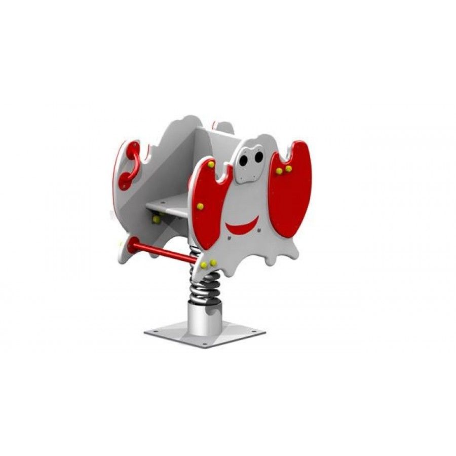 Качалка с декоративными элементами оснащена пружиной. Сиденье со спинкой закрепляются между 2-х панелей в виде краба. Для безопасности ребенка предусмотрено 2 поручня (d 21 мм), подставка для ног (d 26 мм). Опорные плиты, раскосы и основание изготовлены из металлических листов (5 мм). Изделие усилено перекладиной жесткости.