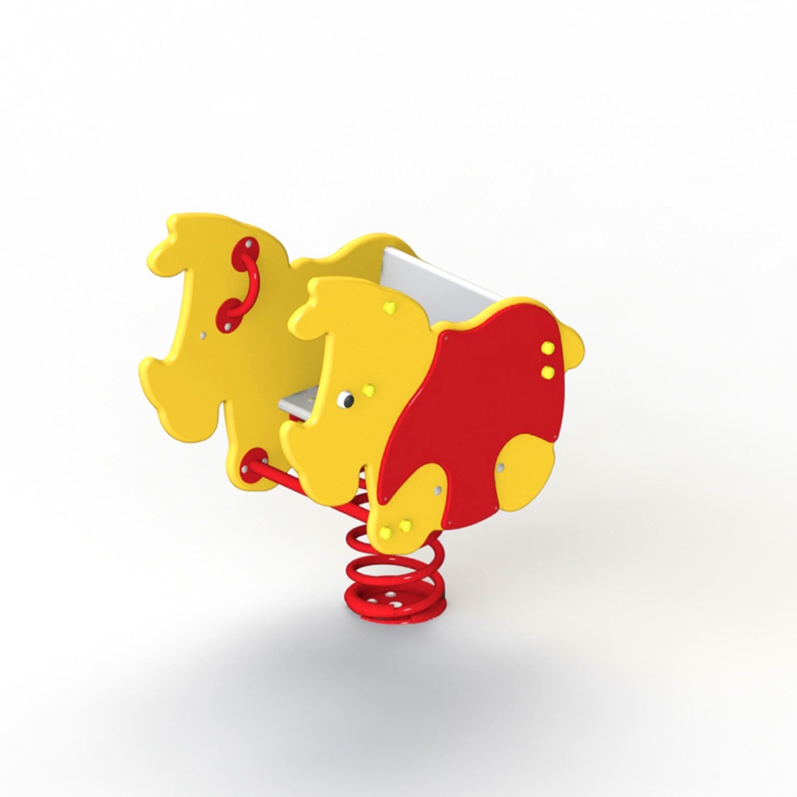Балансир в форме носорога держится на оцинкованной пружине (d 26 мм) с металлическими плитами. Перекладина жесткости придает установке дополнительную прочность. В корпусе выделены сиденье и спинка. К фигурным панелям монтируются поручни (d 21 мм). Опора для ног металлическая (d 26 мм).
