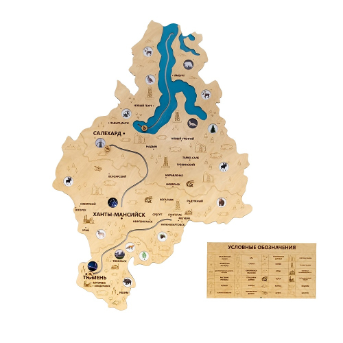 На карте при помощи лазерной резки обозначены населенные пункты, достопримечательности, промышленные объекты, характерные для региона животные, растения, рыбы. На поверхность нанесены лакокрасочное покрытие и латексная печать.