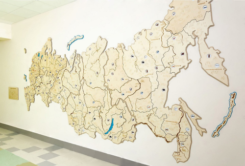 На карте России подписаны города, при помощи лазерной резки обозначены промышленные предприятия. Есть маленькие круглые вставки с изображениями животных, которые обитают в том или ином регионе. При помощи фрезеровки нанесены обозначения рек и гор, а также деление на регионы.