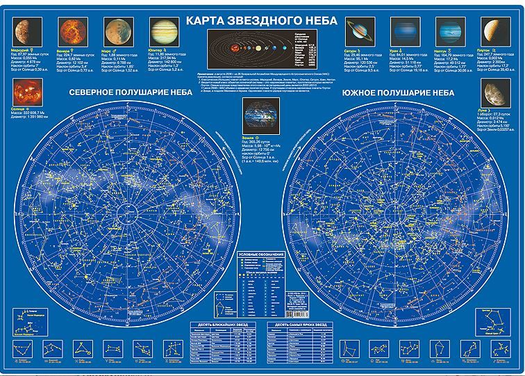 На ламинированной цветной карте изображены северное и южное полушария звездного неба.