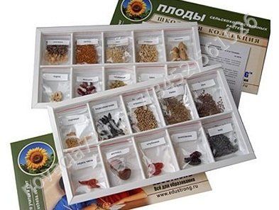 Коллекция сопровождается вкладышем для учащихся с информацией о видах плодов и семян, особенностях их строения.