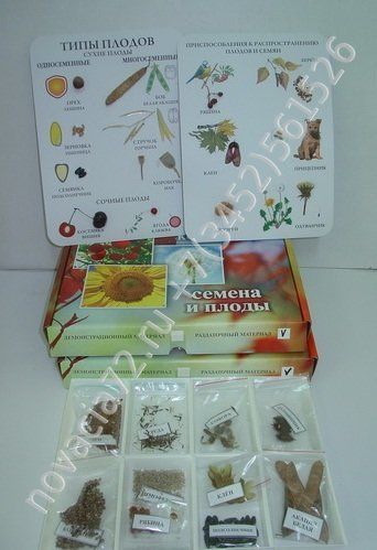 Вторая часть включает раздаточный материал - десять видов различных семян и плодов, которые упакованы в пакеты с подписями. Позволяет определить тип плодов и степень приспособленности к распространению.
