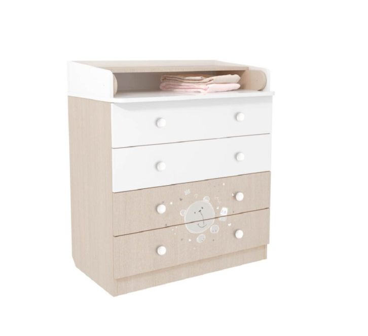 Комод оснащен 4-мя ящиками и верхним полуоткрытым отделением. Ящики выдвигаются. Отделение трансформируется в открытую полку для пеленания. Углы бортиков скругляются. Мебель дополнена фурнитурой. Каркас и 2 нижних ящика представлены в цвете натурального дерева.