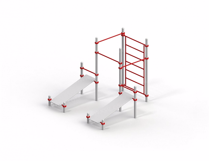 В комплексе 10 разновысоких стоек, 2 скамьи для пресса, разновысокие перекладины, шведская стенка. Это оборудование для тренировки мышц, укрепления позвоночника. Перекладины (d 33 мм) и стойки (d 88 мм) выполнены и металла с гальванизацией.