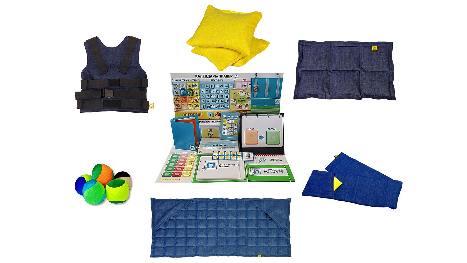 Мячики и утяжеленные изделия (шарф, хлопковые мешочки с песком, жилет, подушка) стимулируют сенсорное восприятие, успокаивают. Аксессуары применяются во время упражнений на развитие координации, внимания и баланса.