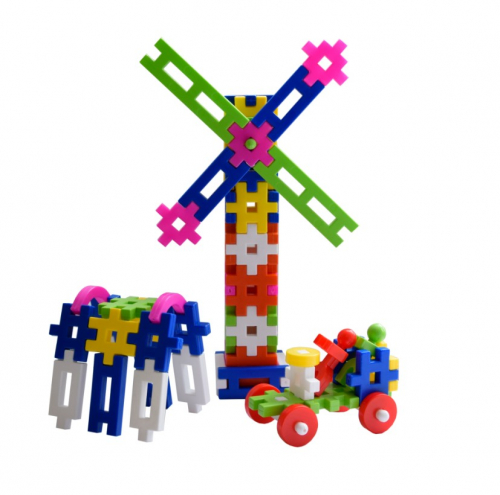 Разноцветные детали конструктора не имеют острых углов. Набор предназначен для конструирования различных 3D-моделей: корабль, мельница, паровоз и пр.