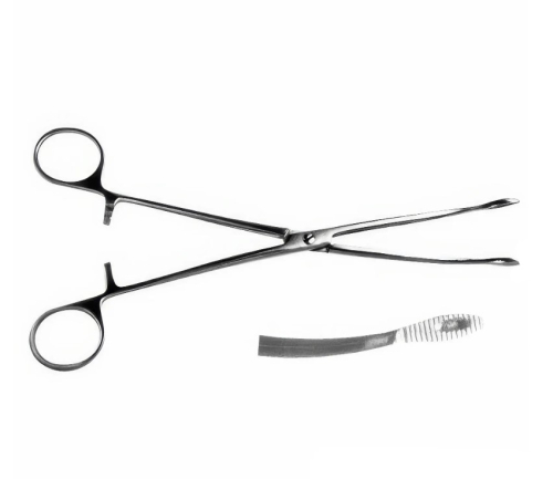 Детский корнцанг представляет собой изогнутый зажим с рабочими элементами.