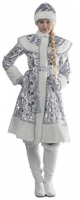 Новогодний наряд, выполненный из такой ткани, выглядит оригинально и не останется незамеченным. Каждый элемент узора выткан серебряными нитями, что делает его ярким и сияющим. Завершает зимний образ оторочка по краям подола, пелерины, рукавов, воротничка и полочек из белоснежного искусственного меха.